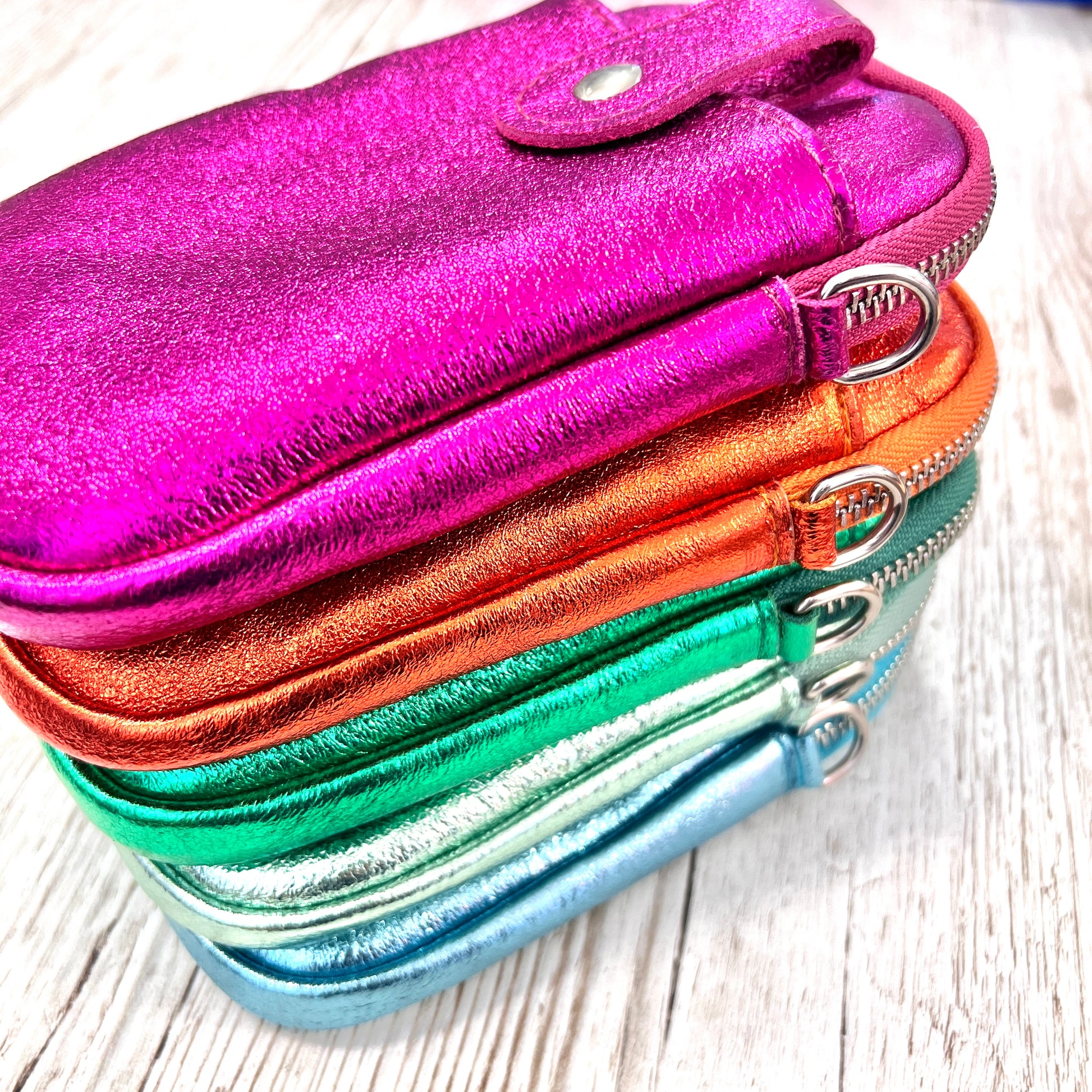 Beautiful metallic brights leather phone bags, superb quality with silver hardware & double zips.